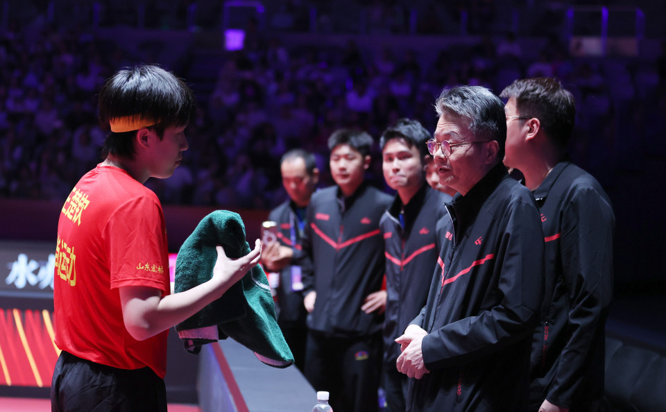 8月30日,山东魏桥·向尚运动队选手王楚钦(左一)在单打比赛间隙接受教练指导。他在单打比赛中3比0战胜四川丰谷队选手孙闻。新华社发(张利民摄)
