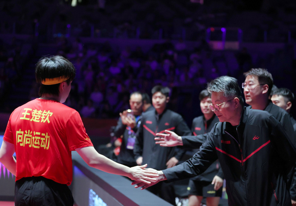 8月30日,山东魏桥·向尚运动队选手王楚钦(左)在单打比赛后与教练击掌。他在单打比赛中3比0战胜四川丰谷队选手孙闻。新华社发(张利民摄)