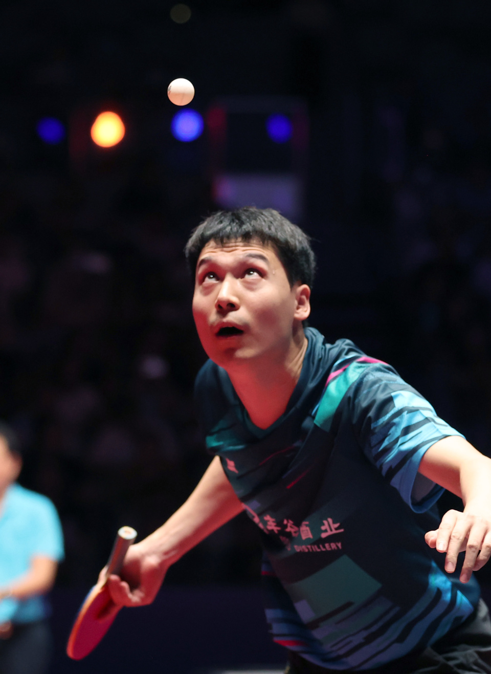 8月30日,四川丰谷队选手孙闻在比赛中。他在单打比赛中0比3不敌山东魏桥·向尚运动队选手王楚钦。新华社发(张利民摄)